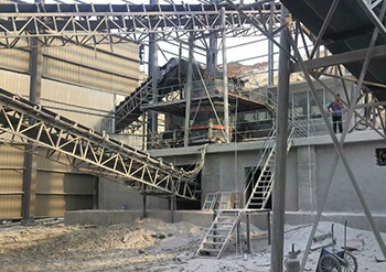 花崗巖原料由顎破破碎后經(jīng)中轉(zhuǎn)料倉進(jìn)入單缸液壓圓錐破HST100,將10-20mm直接篩走作為成品石子,0-10mm,20-30mm經(jīng)皮帶機(jī)進(jìn)入中專料倉進(jìn)高效制砂機(jī)VSI5X9532,出料再返回振動篩篩分,然后成品進(jìn)洗砂機(jī)水洗后經(jīng)皮帶機(jī)輸送至成品料堆。