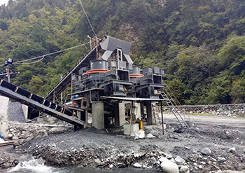 河卵石原料進入歐版液壓顎破PEW760進行粗破,然后經皮帶機進入單缸液壓圓錐破HST250進行二次破碎,然后進入調節料倉,經皮帶機把小于40MM的進入沖擊破VSI5X-1145進行制砂,成品0-5MM精品砂,目前質量和價格完全媲美優質天然河沙。