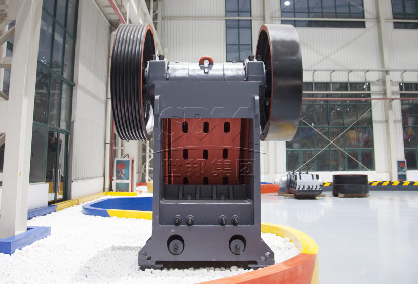 本產品以電動機為動力,通過電動機皮帶輪,由三角皮帶和槽輪驅動偏心軸,使動顎按預定軌跡作往復運動,將進入由固定顎板、活動顎板和邊護板組成的破碎腔內的物料破碎,并通過下部的排料口將成品物料排出。