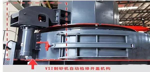 VSI4X和VSI5X制砂機均采用液壓裝置自動啟蓋,方便快捷移開上蓋,降低人工勞動強度,即使只有一人也可以輕松更換轉(zhuǎn)子及其配件,方便檢修,提高使用效率。