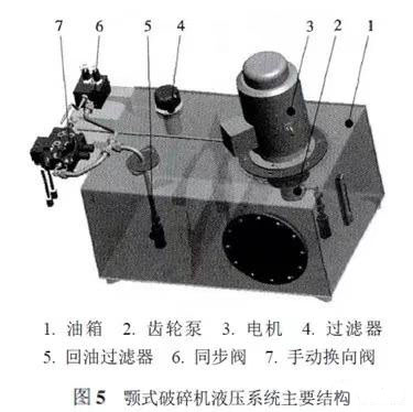 新款顎式破碎機通常使用液壓系統(tǒng)來輔助調(diào)整破碎機排料口大小,方便快捷,其液壓系統(tǒng)主要結構如圖5所示。