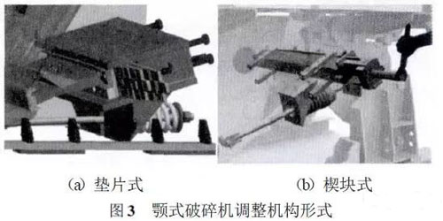 顎式破碎機調(diào)整機構如圖3所示,目前調(diào)整機構形式主要分為墊片式和楔塊式兩種結構。