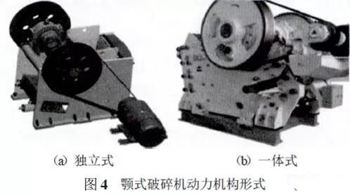 顎式破碎機動力機構如圖4所示,目前動力機構形式分為獨立式和一體式兩種結構。