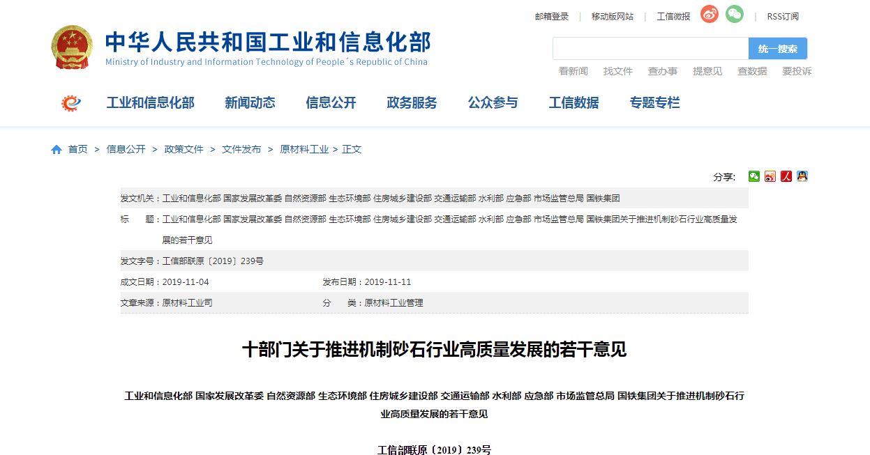 2019年11月11日,工業和信息化部、國家發展改革委、自然資源部、生態環境部、住房城鄉建設部、交通運輸部、水利部、應急部 、市場監管總局和國鐵集團等國家十部門發布《關于推進機制砂石行業高質量發展的若干意見》。在此之前,已有多省出臺政策,通過建立機制砂生產基地、發布機制砂應用標準等措施,促進機制砂推廣應用。