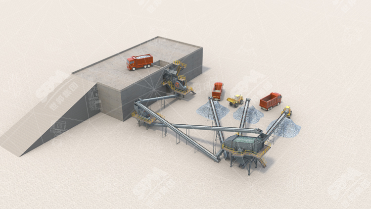 石灰石大塊物料經(jīng)料倉由振動給料機均勻喂料,輸送到顎式破碎機進行粗碎,粗碎后的物料經(jīng)振動篩篩分后,由皮帶輸送機輸送至反擊式破碎機。
