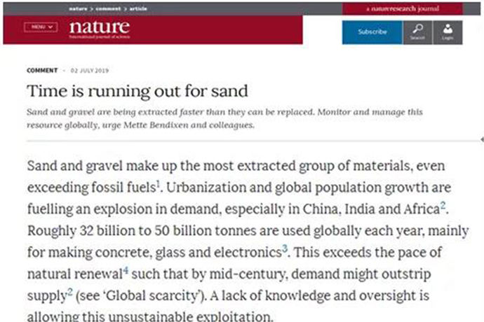 早在2019年,天然砂資源“告急”就已受到國(guó)際科技期刊雜志《自然》的報(bào)道,報(bào)道稱預(yù)計(jì)到本世紀(jì)中葉(2050年),地球上天然砂資源可能就再也滿足不了人類(lèi)如此巨大的用砂需求,天然砂資源開(kāi)采速度過(guò)快,天然砂供應(yīng)開(kāi)始“岌岌可危”。
