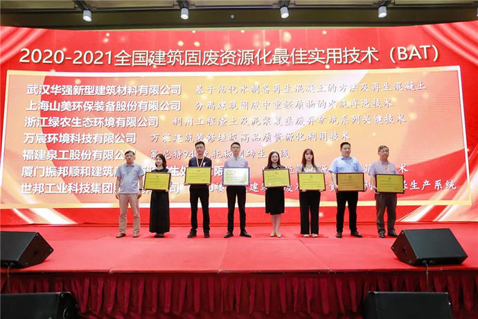 開幕式上進行了頒獎活動,世邦集團VU樓站式建筑固廢及尾礦資源再利用環保生產系統榮獲“全國建筑固廢資源化理想實用技術”(BAT)。