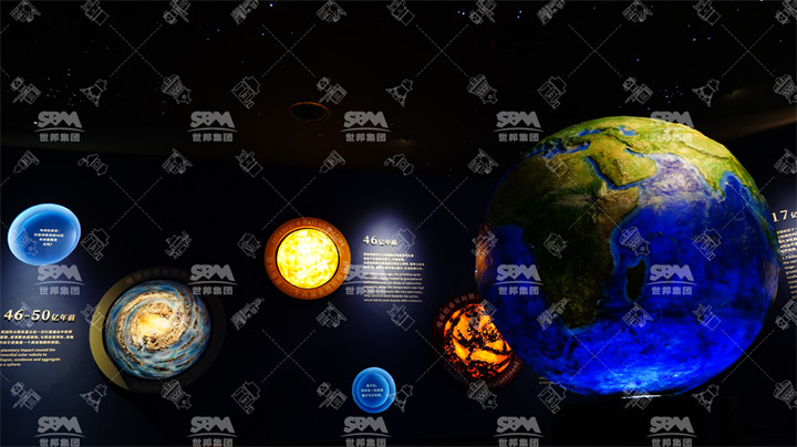 推門而入,映入眼簾的便是利用3D打印技術造的小型宇宙,還原了宇宙50億年的滄桑巨變。同樣結合3D打印技術,我們制作了一個仿真地球,較大程度還原了地球表層的地質地貌。在巖石的分類區,您可以看到由1815塊石頭砌成的礦洞,這些石頭均來自世邦自有石料礦,包含火成巖、沉積巖、變質巖。