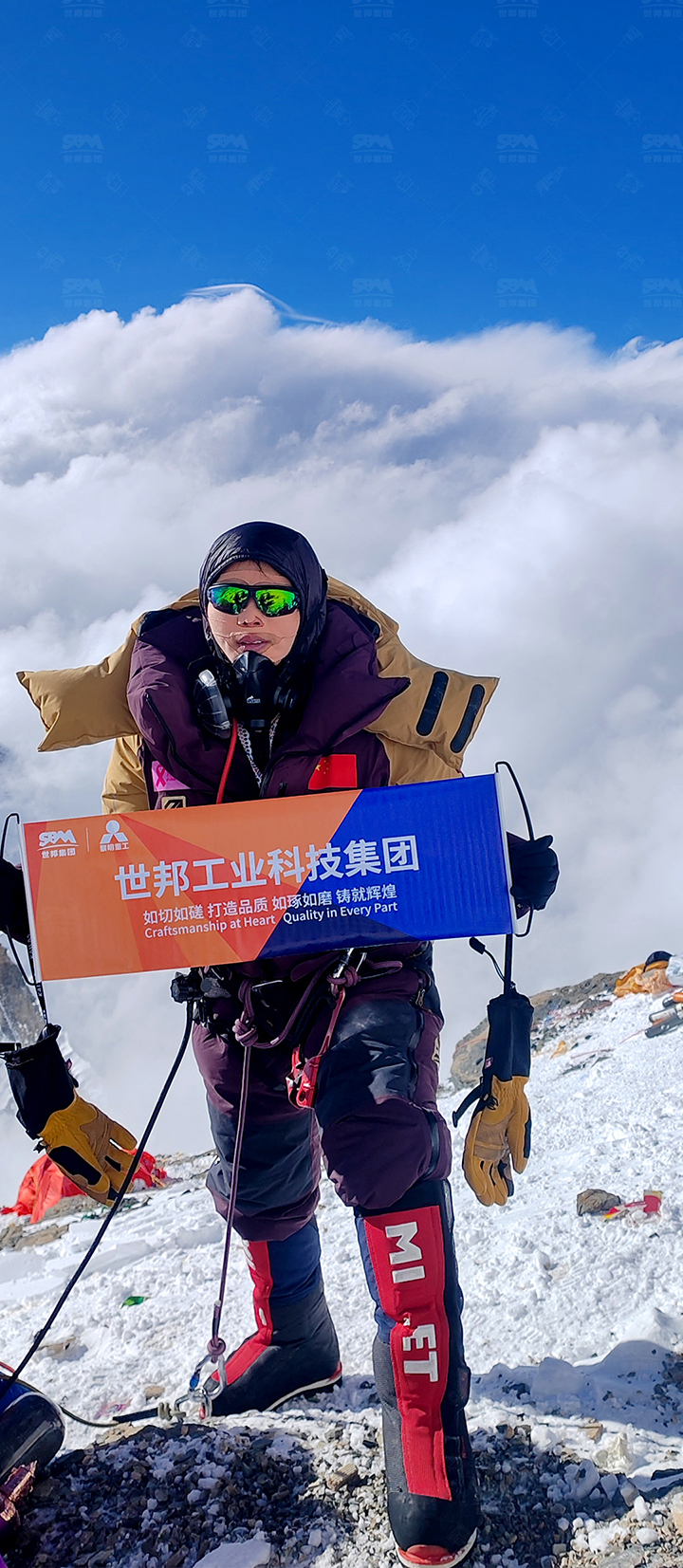 2025年5月24日,河南省首位登頂珠穆朗瑪峰的女性、當(dāng)代藝術(shù)家孫寧,繼 2019 年、2023 年南坡登頂后再次成功從北坡登頂,耗時(shí)6天完成“雙側(cè)貫通”,成為河南首位實(shí)現(xiàn)珠峰南北雙登的登山者。第三次站上世界之巔完成了“雪山玫瑰”末了一次由北坡登頂?shù)脑竿诤0?8848.86 米的珠峰峰頂她舉起印有“世邦工業(yè)科技集團(tuán)”字樣的旗幟,讓攀登者的無畏意志和中國(guó)企業(yè)的創(chuàng)新精神,共同在世界理想點(diǎn)迎風(fēng)招展。