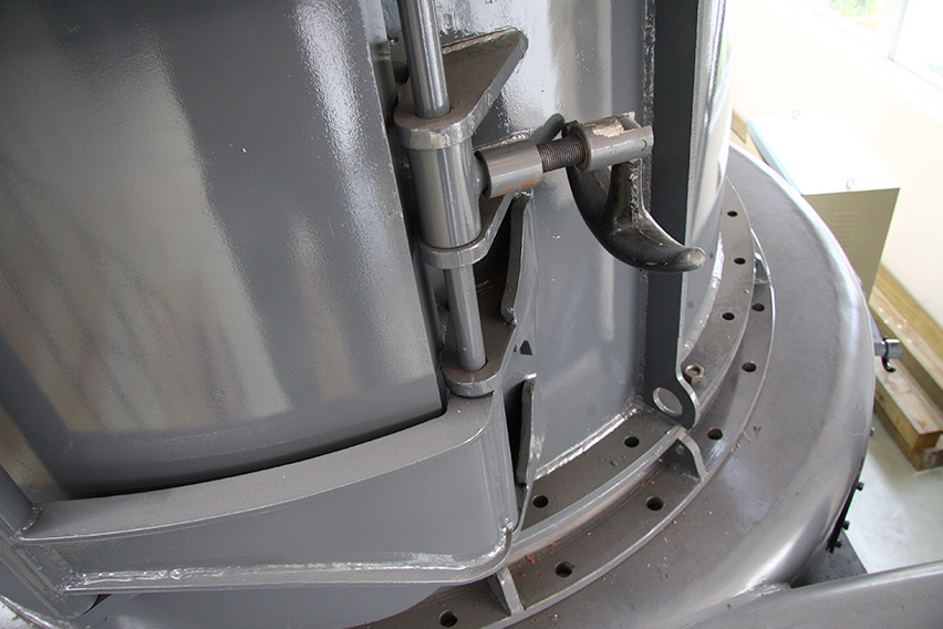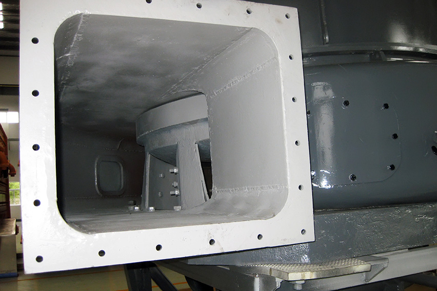 傳統磨機的進風蝸殼觀察門內部門板內面向外凸出,與進風蝸殼內面不在一個平面上,這樣就易產生渦流效應,增加系統能耗。MTW歐版梯形磨粉機采用內部門板內面與進風蝸殼內面在同一曲面上,這樣就能有效的避免渦流效應,風量損失小,物料流動性更好。
