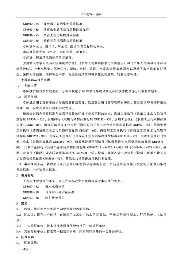 本標(biāo)準(zhǔn)按照污水排放去向,分年限規(guī)定了69種水污染物理想允許排放濃度及部分行業(yè)理想允許排水量。本標(biāo)準(zhǔn)適用于現(xiàn)有單位水污染物的排放管理,以及建設(shè)項(xiàng)目的環(huán)境影響評價(jià)、建設(shè)項(xiàng)目環(huán)境保護(hù)設(shè)施設(shè)計(jì)、竣工驗(yàn)收及其投產(chǎn)后的排放管理。
